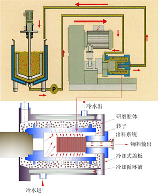 可實現(xiàn)低溫砂磨 縮短漿料在磨腔內(nèi)的滯留時間,有效抑制溫度上升。 通過循環(huán)冷卻水的冷卻,可實現(xiàn)低溫砂磨。 |